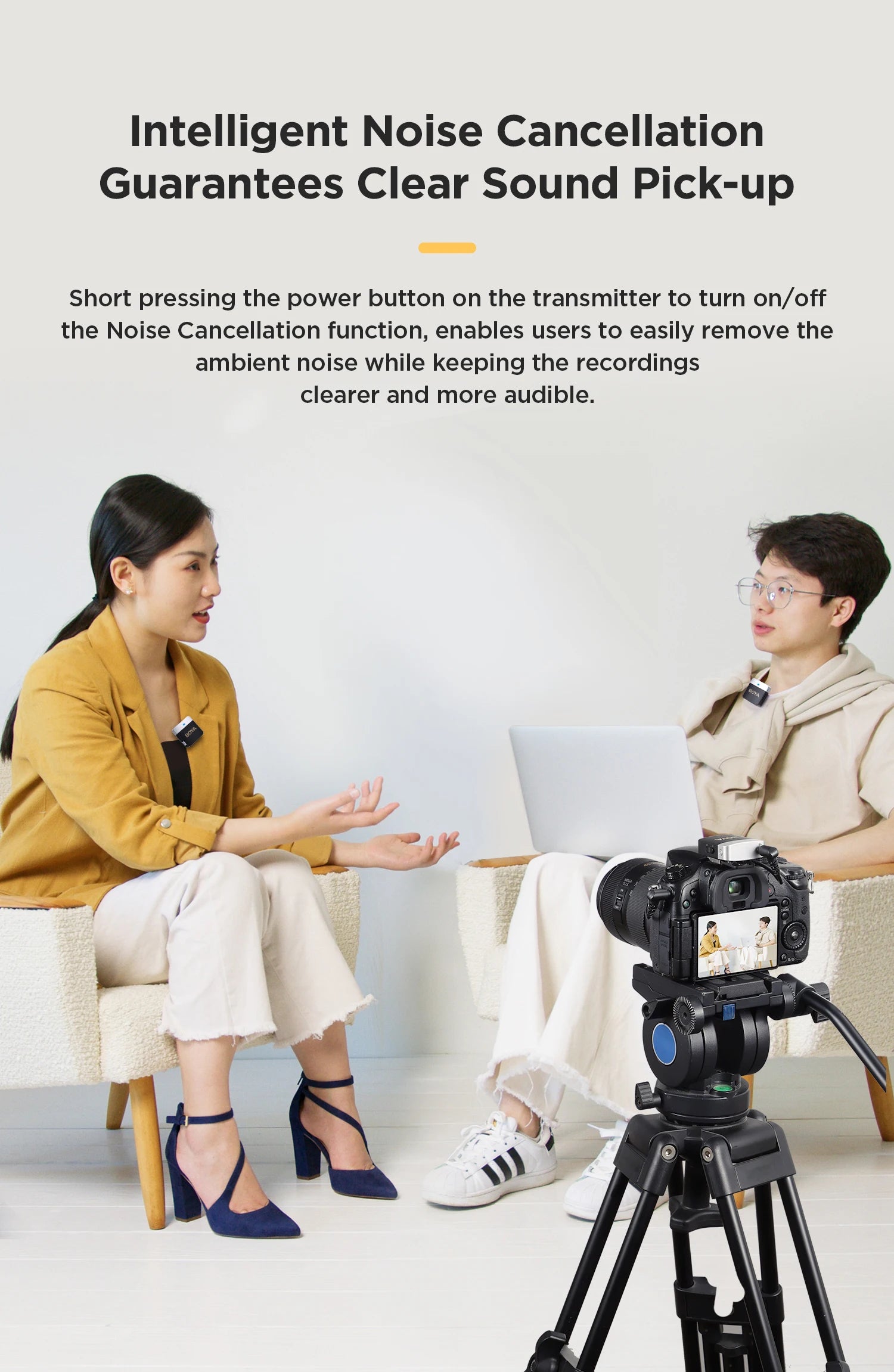 Con un alcance superior a 60 metros (sin obstáculos) y tecnología de transmisión 2.4GHz ISM, garantiza una señal estable y sin cortes. Su micrófono omnidireccional captura la voz con naturalidad, mientras la cancelación de ruido integrada asegura grabaciones limpias incluso en entornos ruidosos.