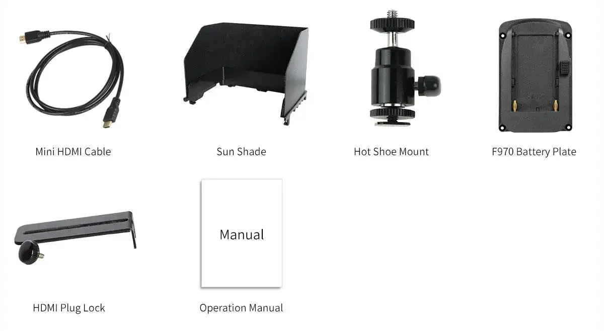 Standard Accessories: Sunshade,F970 Plate,Hot Shoe Mount,HDMI Cable,HDMI plug lock,Manual