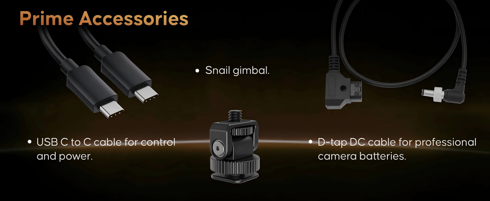 What's in the box: G7 Pro,Dtap-to-DC cable,USB-C cable for power and camera control,snail gimbal