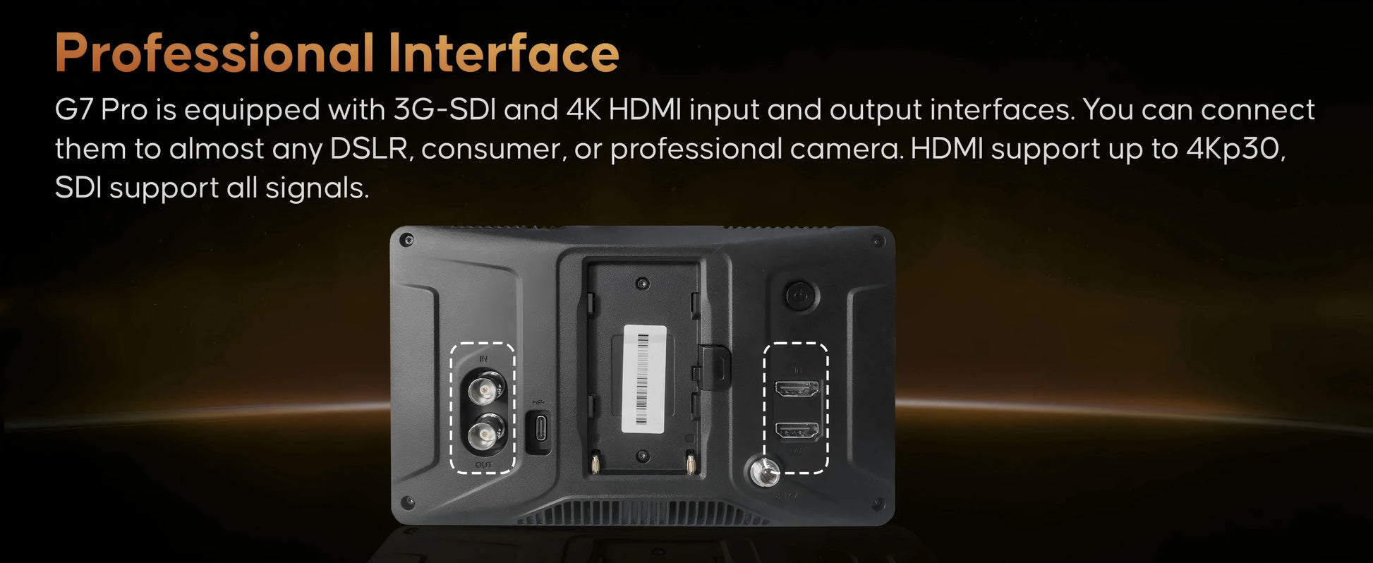 Focus Tools and More: Focus Assist,Peaking;DE-LOG,MULTI-SCOPES,Display Rotate,Audio Meter(Only SDI),Time Code(Only SDI)