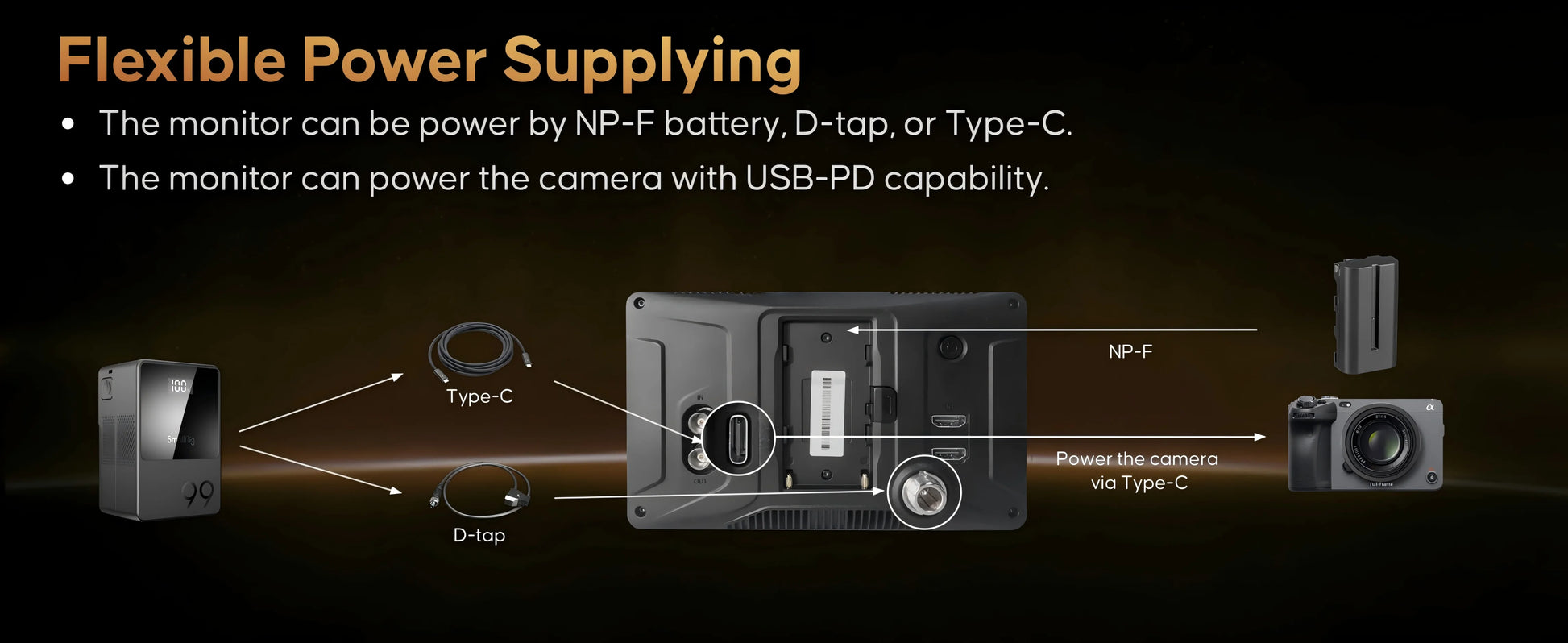 Power Supply: 7-16V DCinput with D-Tap to DC cable,USB-PD,NPF battery