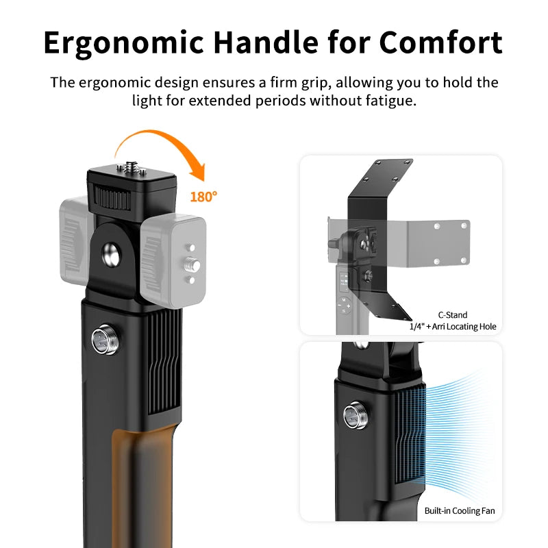 Rotación de 180° con asa ergonómica + montaje C-Stand / 1/4” / Arri Locating Hole.