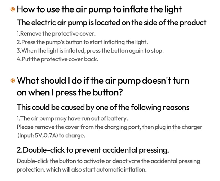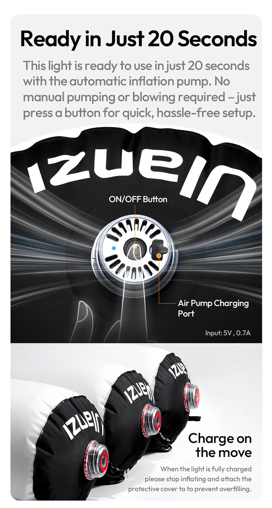 Luz LED inflable portátil, lista en solo 20 segundos gracias a su bomba automática.