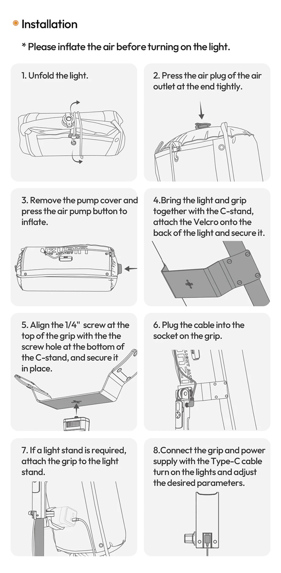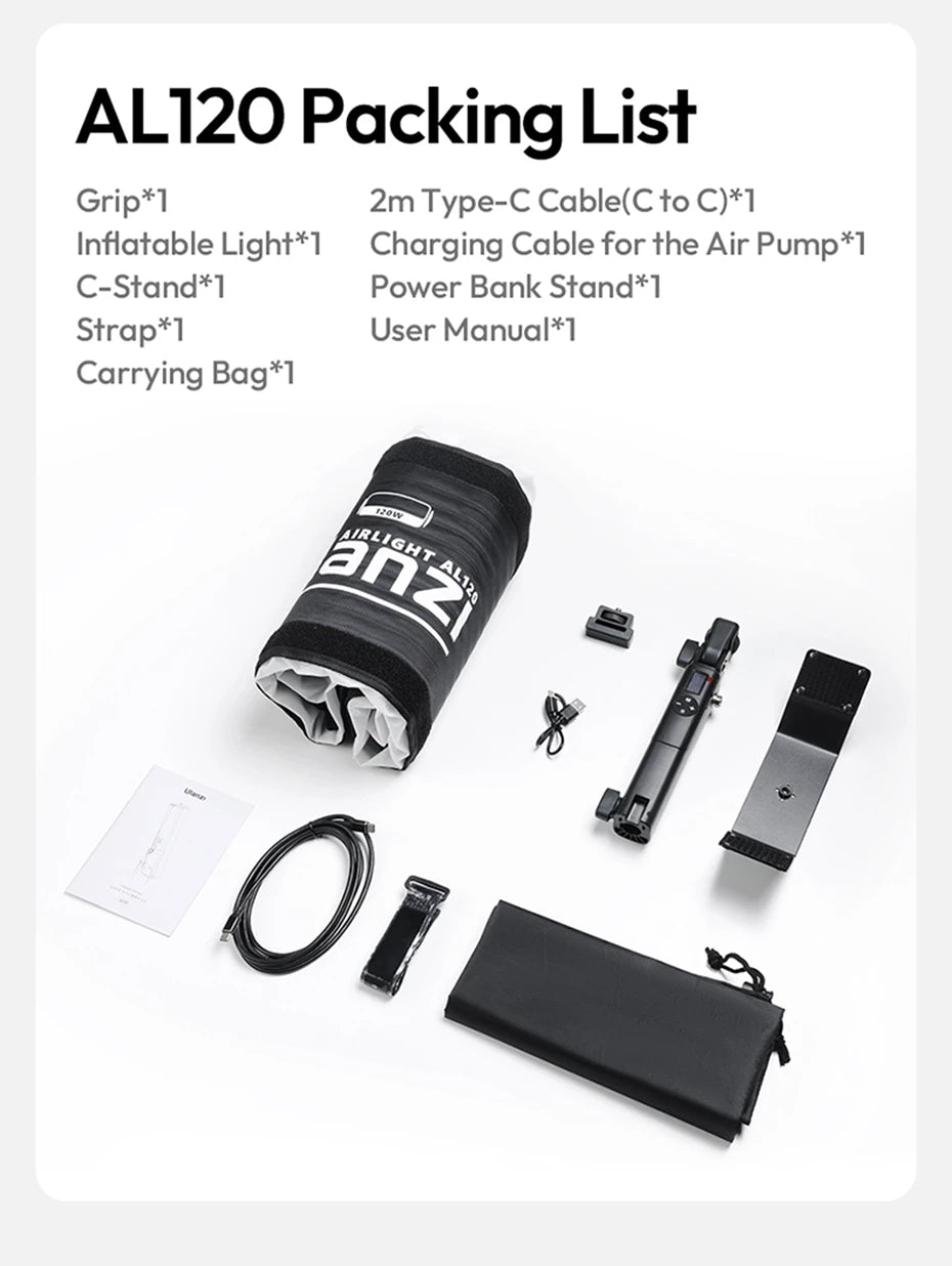 Incluye: luz inflable, grip, C-stand, cable Type-C, soporte para power bank, correa, bolso de transporte y manual.