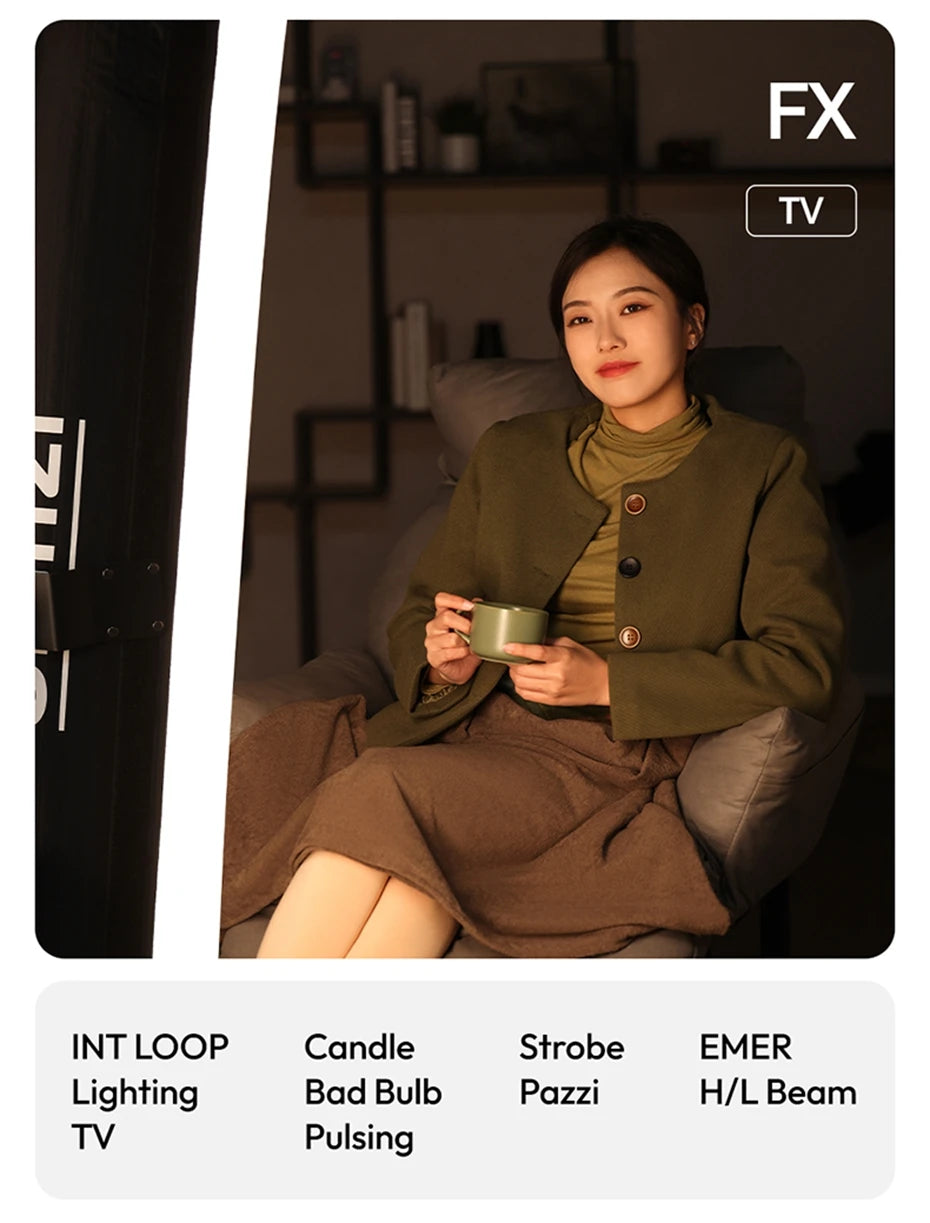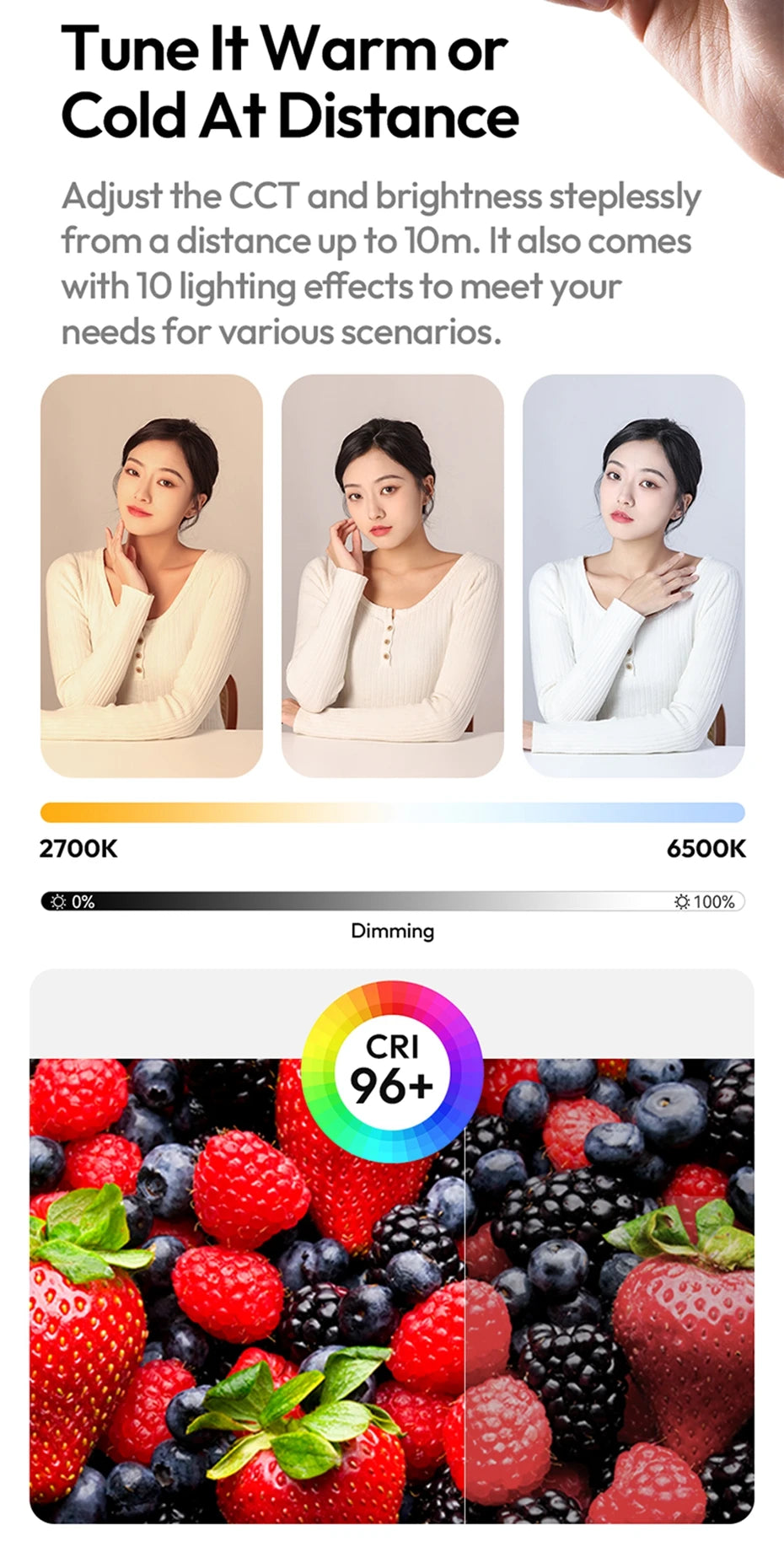 Con un rango de color ajustable de 2700K a 6500K, ofrece tonos cálidos o fríos con precisión, mientras que el control de brillo del 0 al 100% permite personalizar la iluminación en cada toma. Su CRI ≥96 asegura colores naturales y realistas, y además integra 10 efectos de luz creativos para ampliar tus posibilidades en cine y producción audiovisual.