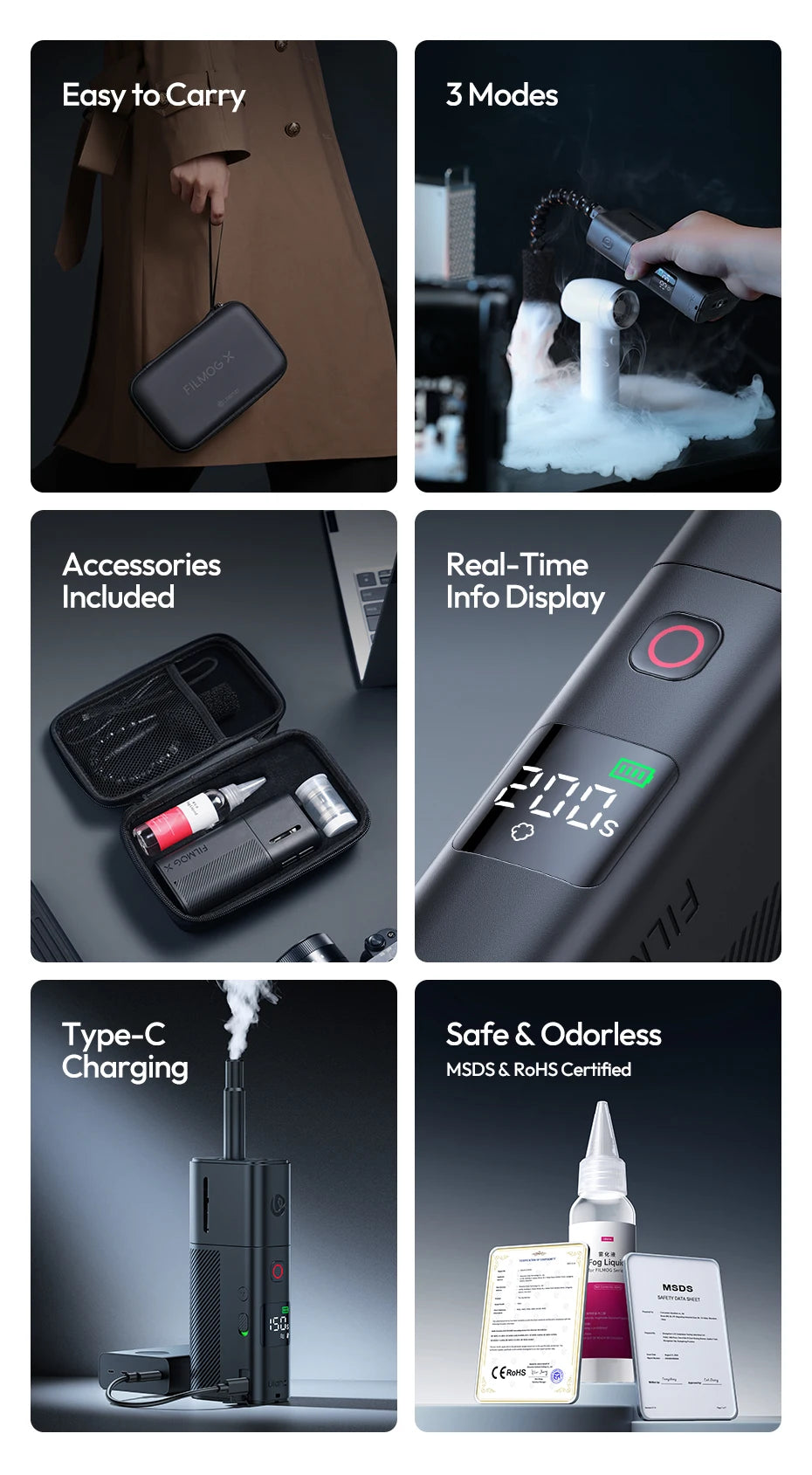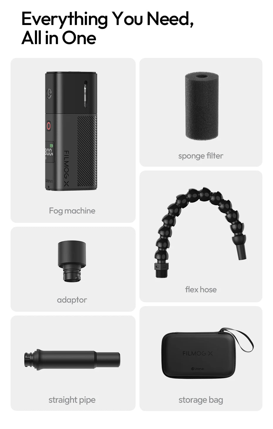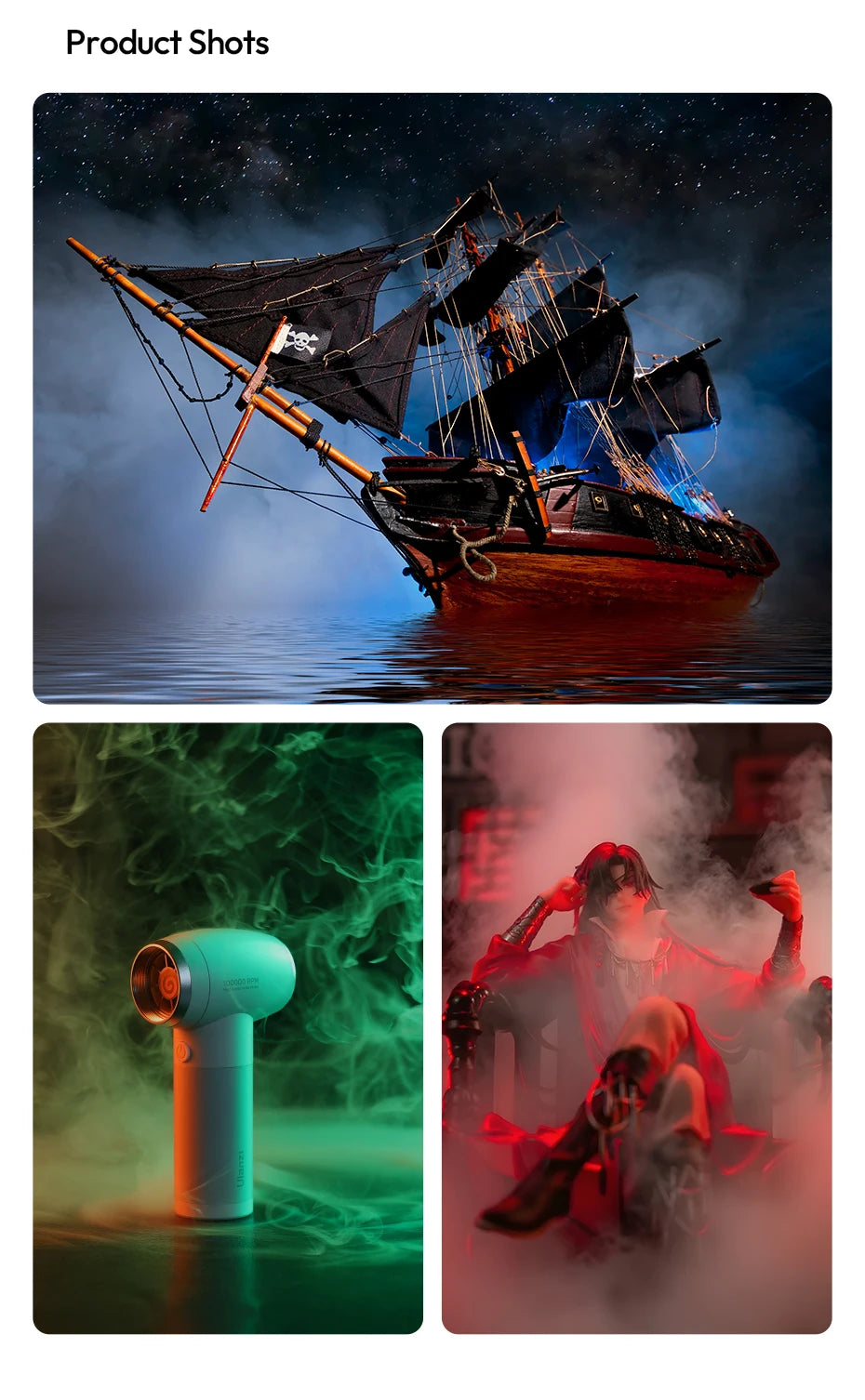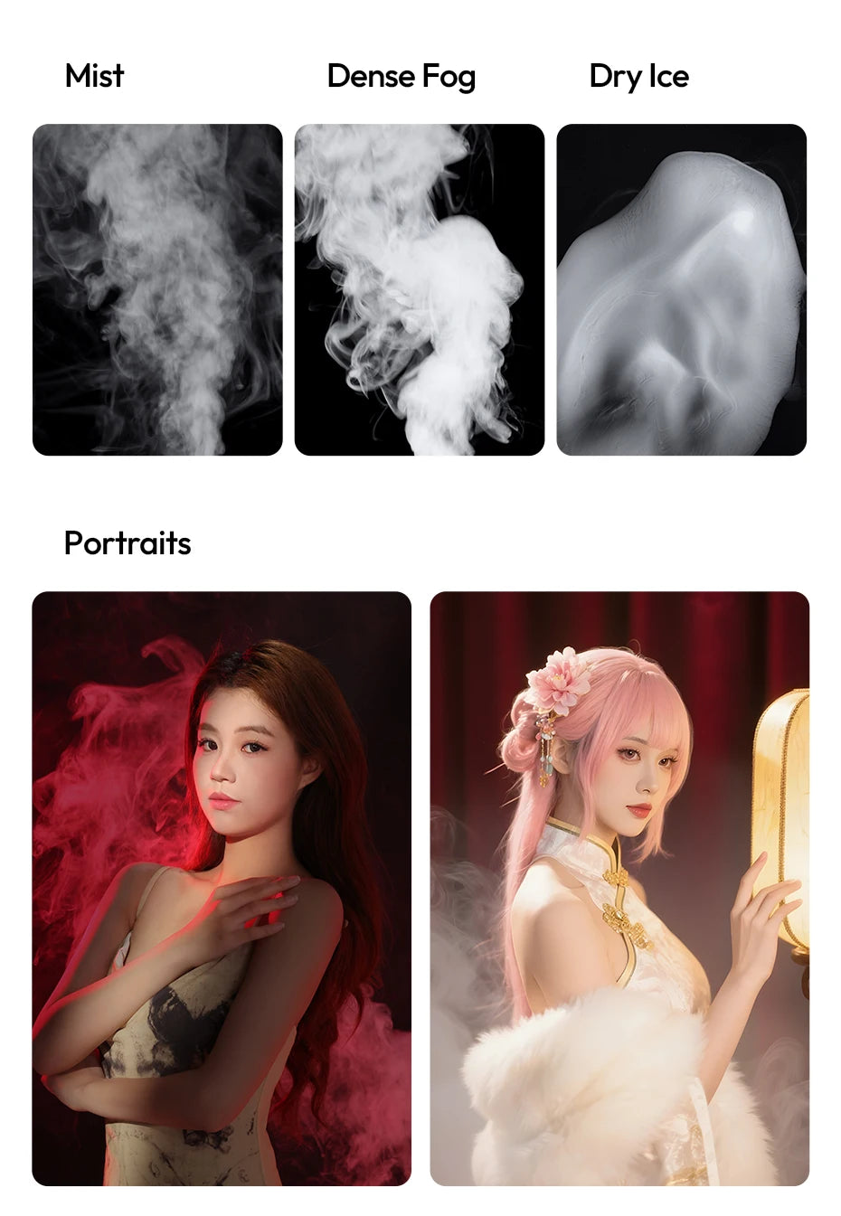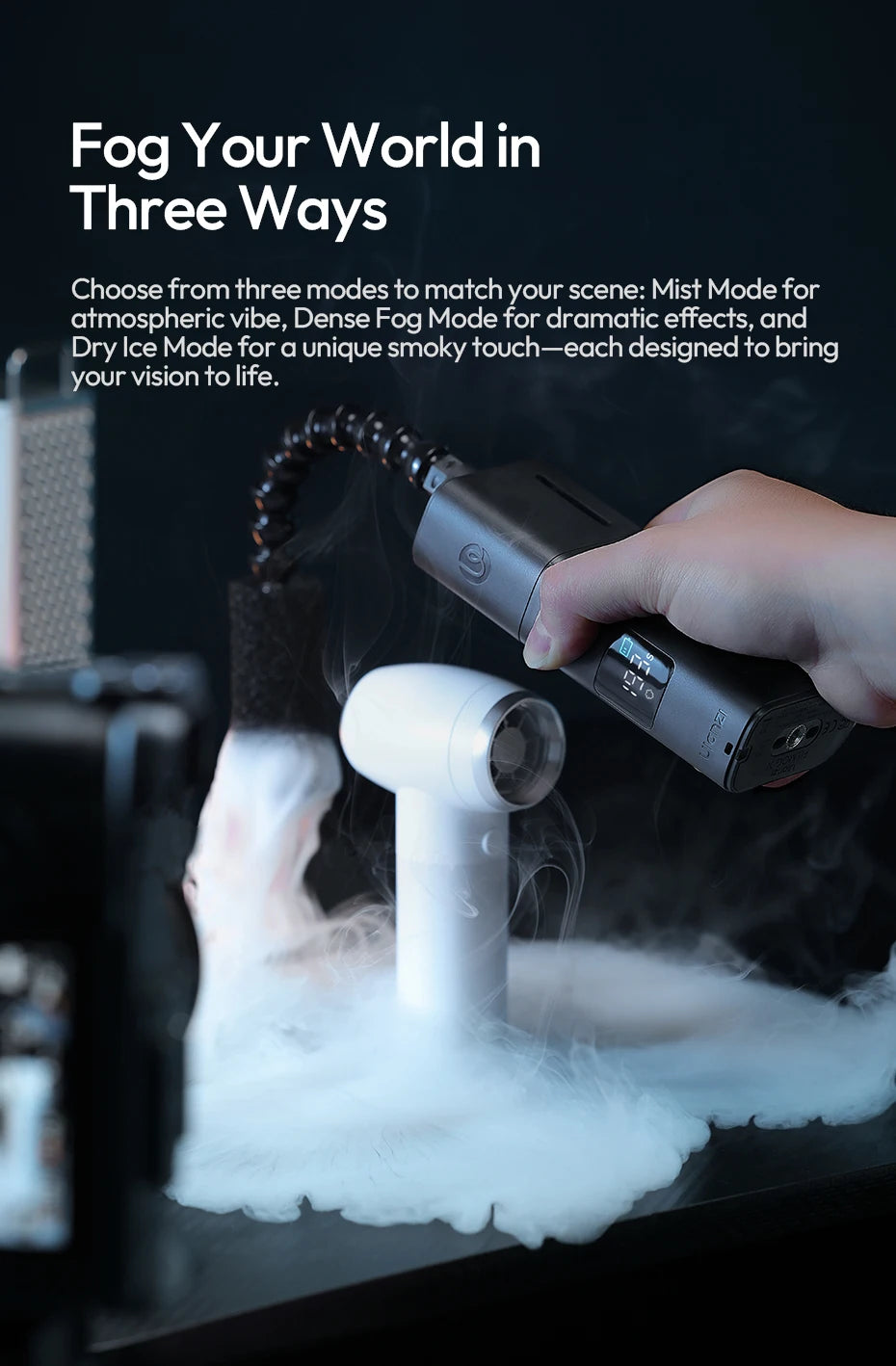 Su diseño compacto la convierte en una herramienta ideal para creadores de contenido que buscan darle un toque cinematográfico a sus tomas, logrando atmósferas únicas en segundos. Con 3 modos de intensidad de niebla, se adapta a cualquier escenario, desde un sutil efecto ambiental hasta una niebla densa para efectos dramáticos.