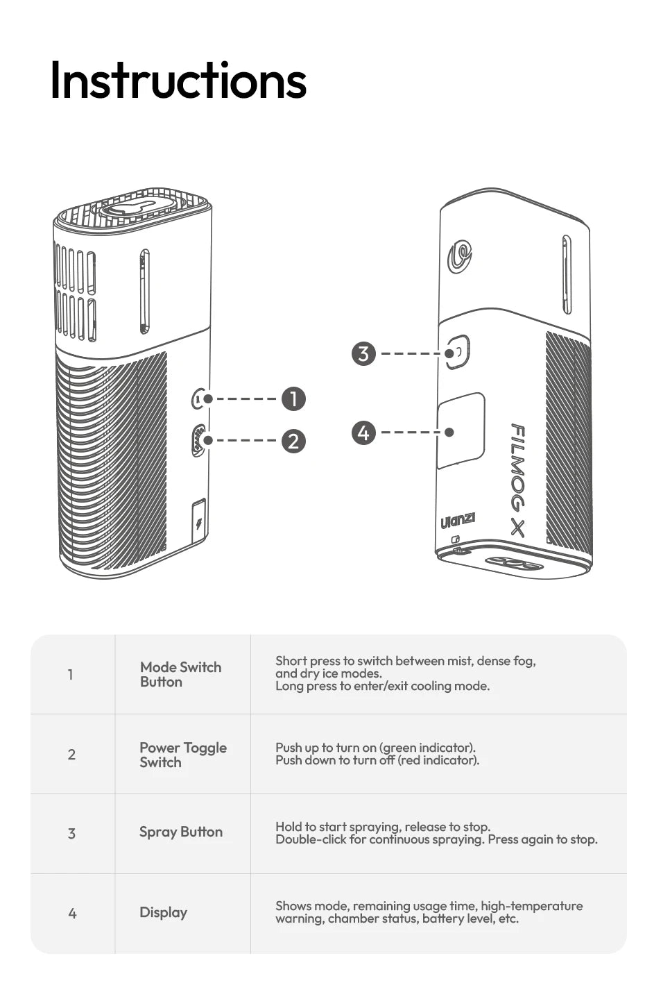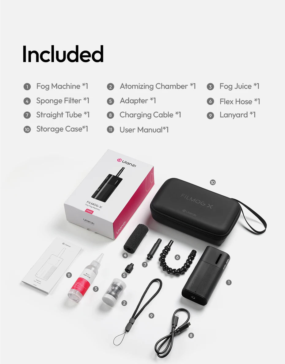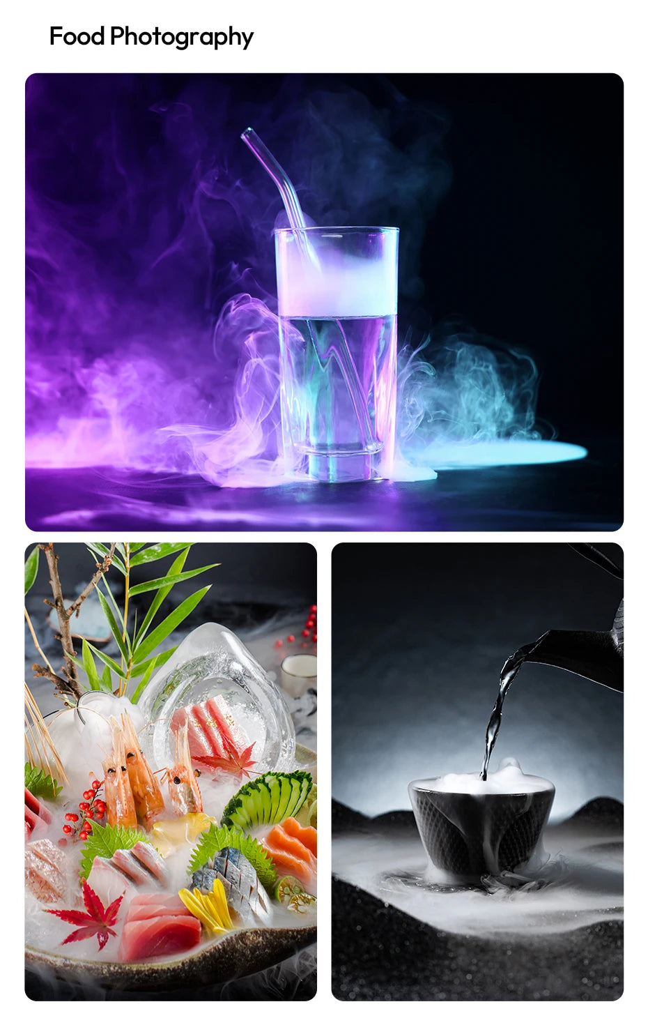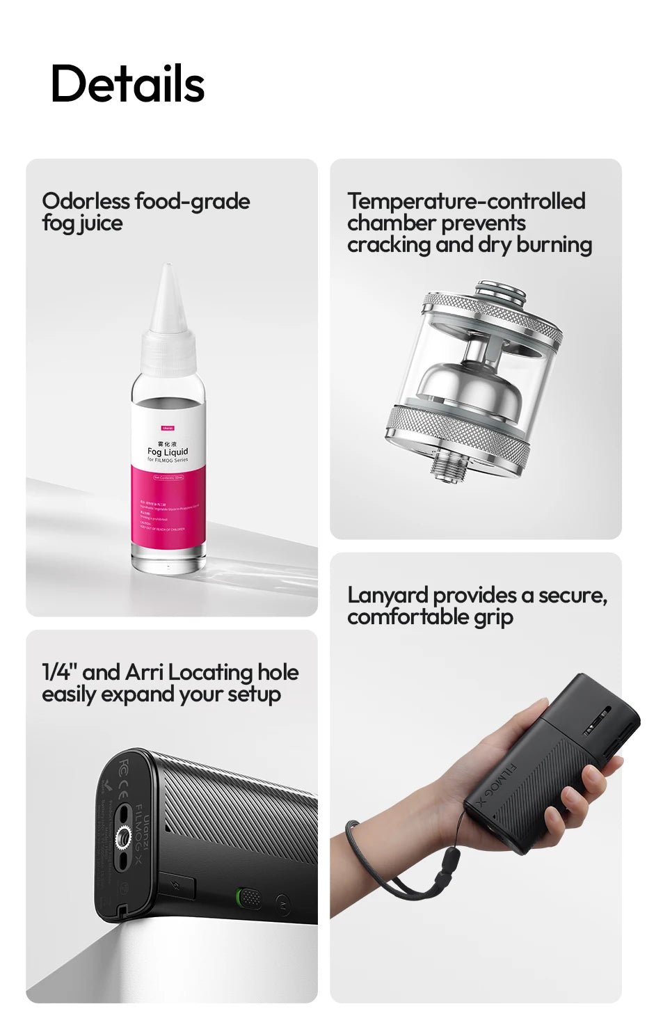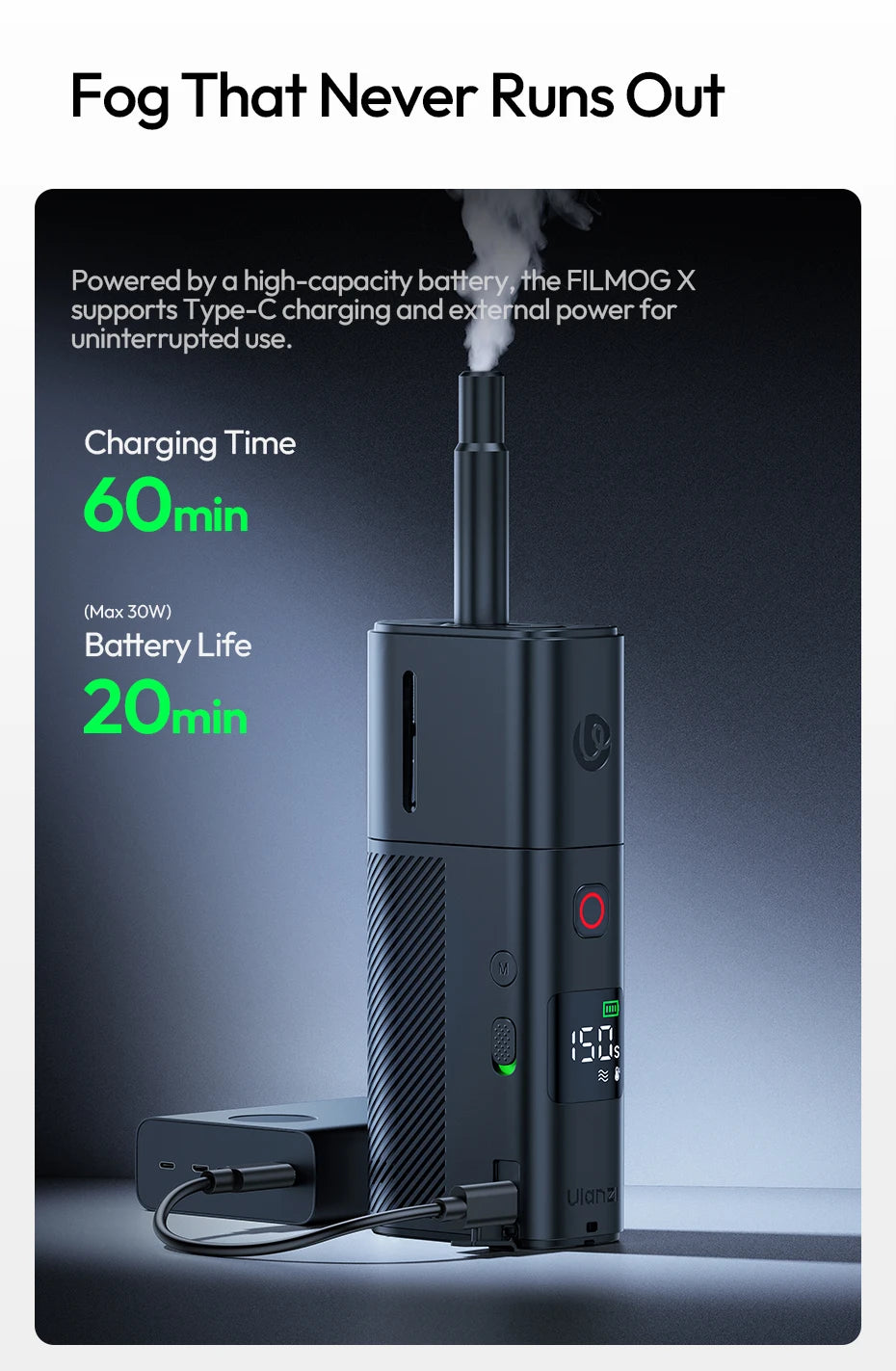 Su diseño compacto la convierte en una herramienta ideal para creadores de contenido que buscan darle un toque cinematográfico a sus tomas, logrando atmósferas únicas en segundos. Con 3 modos de intensidad de niebla, se adapta a cualquier escenario, desde un sutil efecto ambiental hasta una niebla densa para efectos dramáticos.