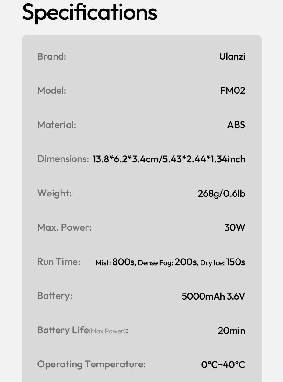 La Ulanzi FM02 es una máquina de humo portátil diseñada especialmente para fotografía y producción audiovisual. Con su sistema eléctrico recargable por Type-C, permite generar efectos de niebla densa y realista sin necesidad de hielo seco ni equipos grandes, ofreciendo versatilidad para retratos, fotografía de productos, gastronomía, cine y contenido creativo.