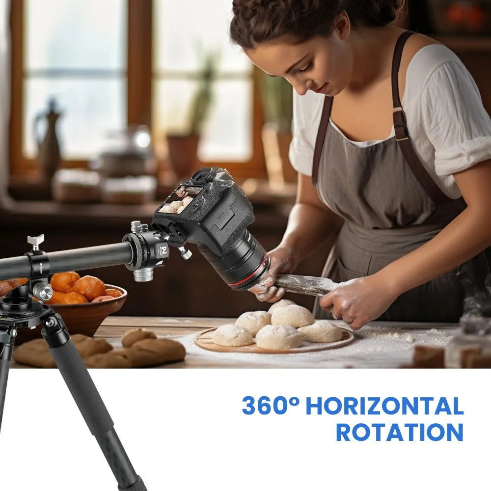 Gracias a su diseño versátil, el TZ8 permite cambiar rápidamente entre modo columna central y modo brazo horizontal, ideal para fotografía panorámica 360°, tomas cenitales, macrofotografía o grabaciones en ángulo inclinado. Además, cuenta con gancho de contrapeso en la base para mejorar la estabilidad al trabajar con equipos más pesados.